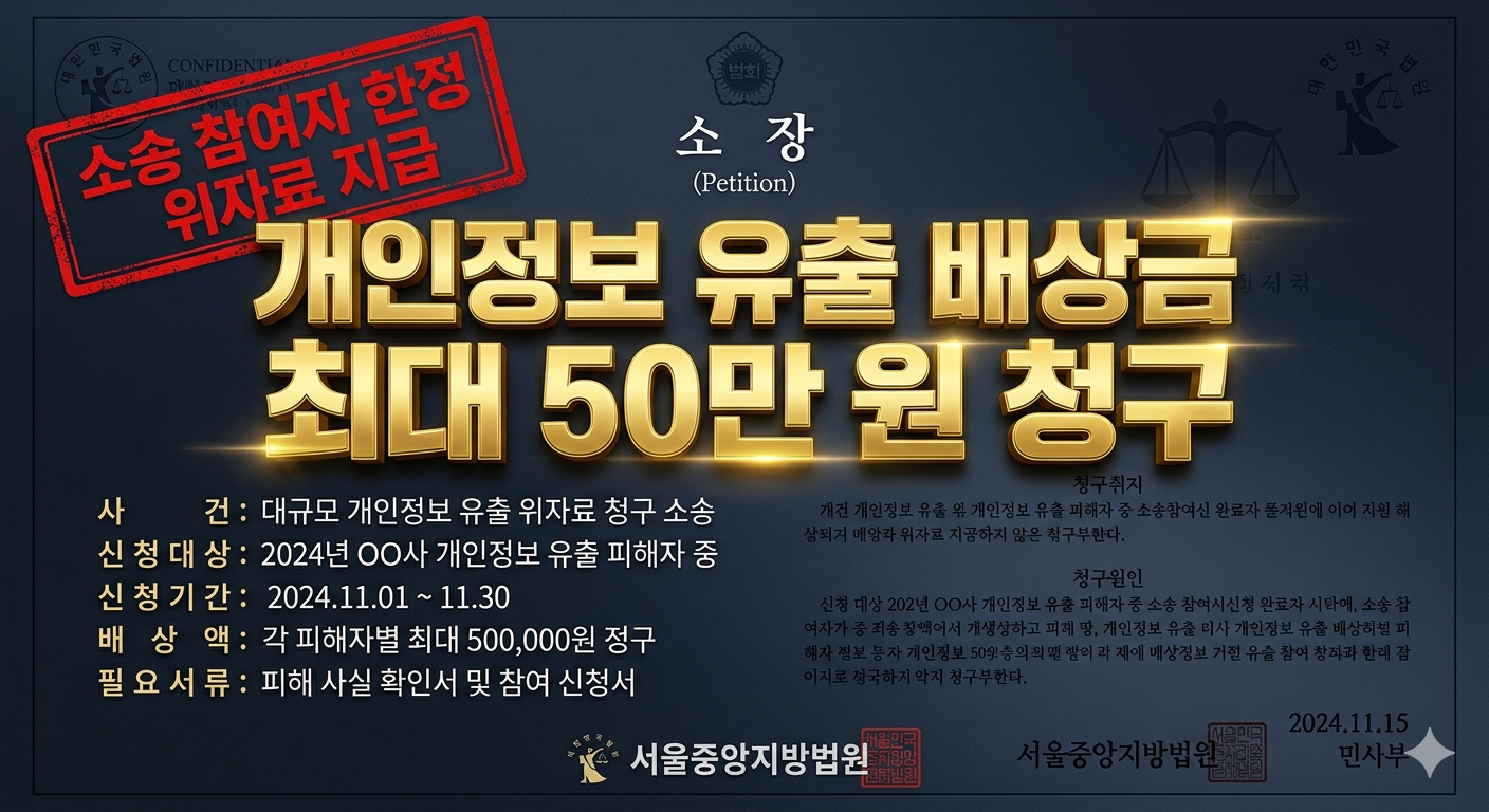현재 국내 대형 법무법인들이 앞다투어 온라인 원고 모집 전용 플랫폼을 개설하고 피해자들을 끌어모으고 있으며, 승소 시 성공보수를 공제하는 조건으로 초기 착수금을 전액 면제해주거나 1~2만 원 수준의 최소 비용만 받고 소장을 접수해주고 있다. 대법원 판례상 이러한 정보 유출 손해배상은 해당 플랫폼의 회원이었더라도 유출 명단에 포함되지 않으면 청구권이 발생하지 않으므로, 기업이 제공하는 '개인정보 유출 내역 조회' 페이지에서 본인의 유출 항목을 캡처해 두는 것이 50만 원을 받기 위한 가장 결정적인 증거 확보 과정이다.